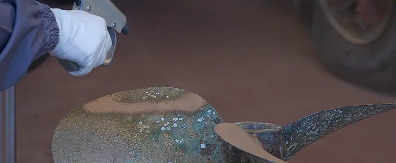 L'aérogommeuse portable IBIX utilisée à sec à basse pression est le système privilégié par les chantiers nautiques pour le nettoyage des hélices. Opération extrêmement délicate que ne doit nécessairement pas provoquer d'altérations des surfaces.